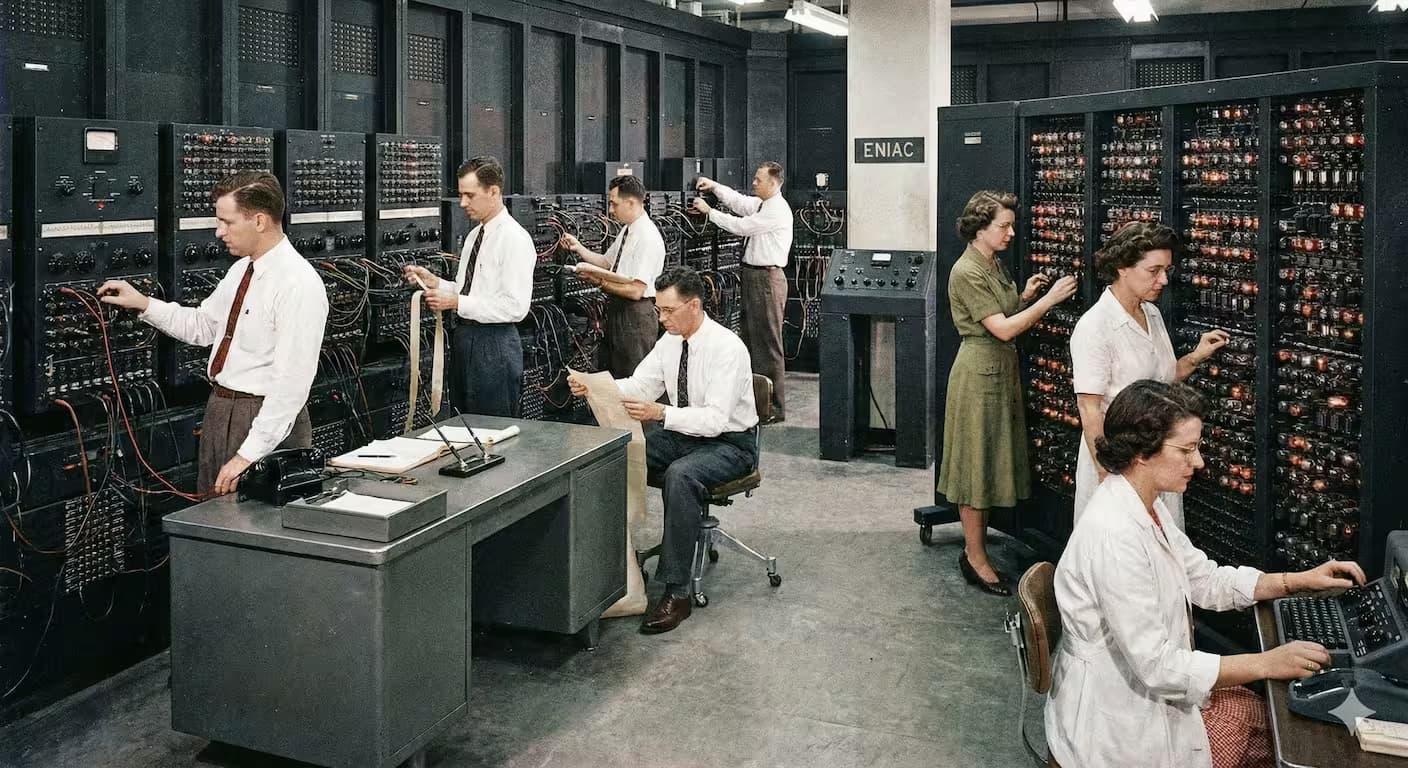 - Operación: No existían lenguajes de alto nivel ni SO. La ejecución era rudimentaria: los ingenieros programaban directamente en lenguaje de máquina mediante tableros de conexiones o tarjetas perforadas. El programador era también el operador físico de la máquina.